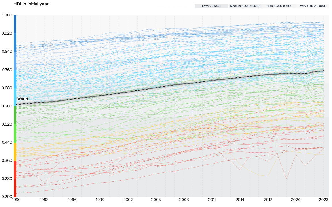 Human development is on the rise. Despite the fact that governments are doing worse, scientific programs and human advancements are doing better, as evidenced by the fact that nearly every country on the UN’s Human Development Index has been on an upward slope since 1990. Life expectancy is on the rise, more people are being educated than ever before, and more people are earning a good living.