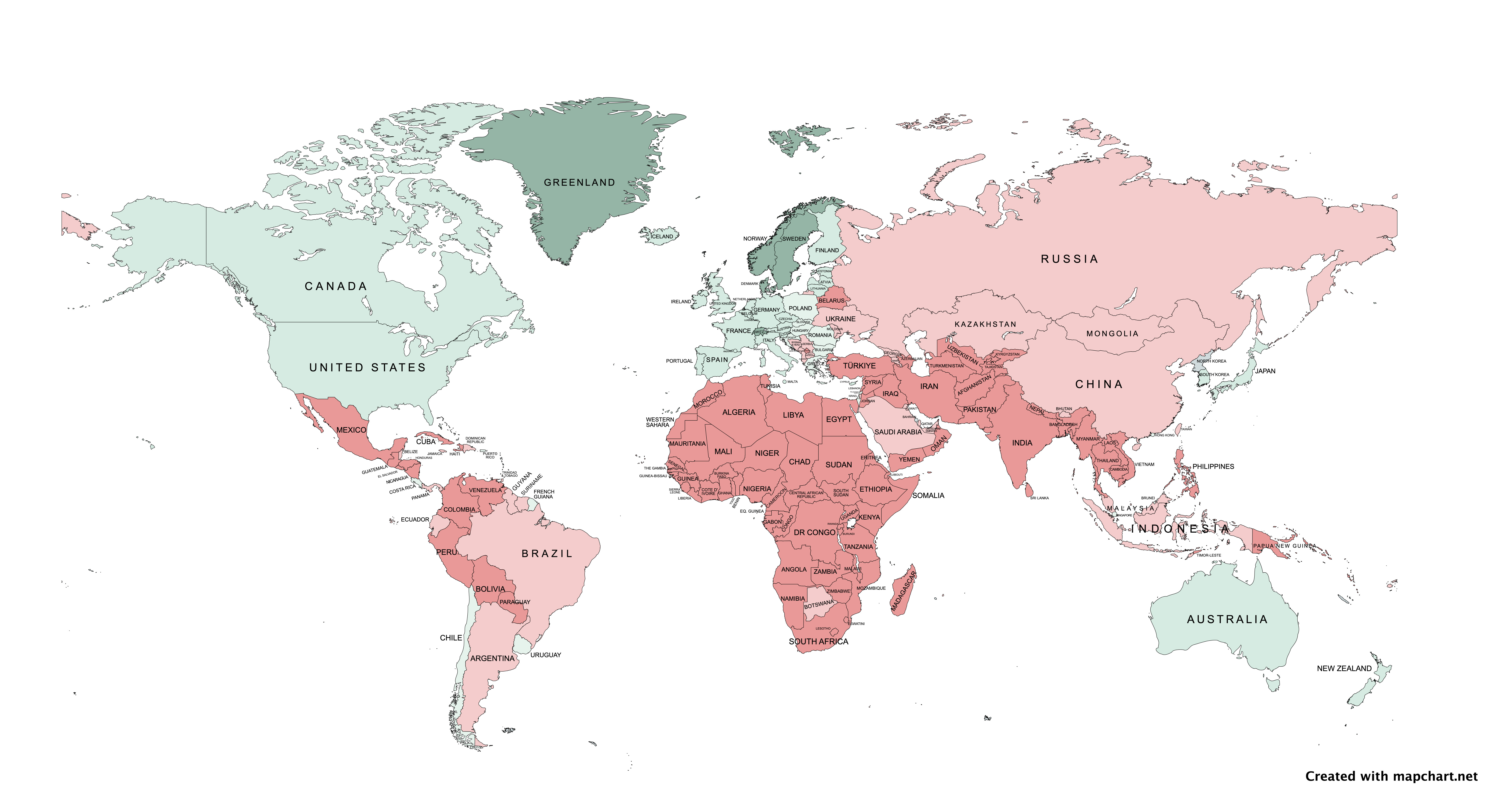 Freedom House and V-DEM (35% of the total score). These organizations score countries on democracy, rights, and human freedoms. Freedom House tracks 25 metrics relevant to political rights and civil liberties, but not in a very granular way—if countries have elections, they tick that checkbox. V-DEM tracks six metrics but goes deep on them—is decline caused by courts, media, elections, or civil society? I averaged these two indices together, but gave 60% of the weight to V-DEM as it’s the more granular and authoritative source.