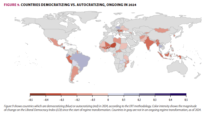 Autocracy is on the rise. Countries across the board are seeing lower governance scores compared with 10 years ago, and, as a result, many have fallen below the “autocracy” threshold. Only 19 countries and less than 6% of the world’s population have shifted into democracy, largely Brazil, Poland, and Thailand. Meanwhile, 45 countries and 38% of the world’s population have shifted into autocracy—largely Asia, but also Mexico, and many Middle Eastern and African countries. Here are the countries that have shifted the most in a democratic direction (blue) and autocratic direction (red):