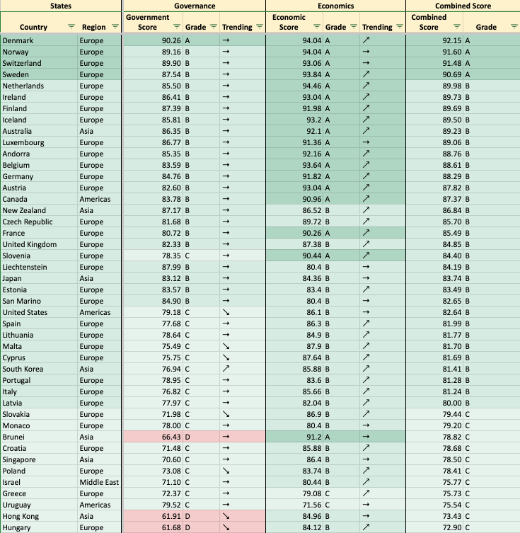 Now that I had a baseline understanding of how all of our countries are doing, I wanted to understand how things are trending. Are the various countries on this list trending in a good direction? Or a bad one? To figure this out, I went back to all of those sources and added numbers from 10 years ago. Most countries fluctuate up or down by 3 points depending on minor reforms or setbacks, but they can swing by up to 5 points in the case of major reforms or setbacks, or can even gain or lose 10 points in the case of a complete overhaul or collapse. Based on this understanding, if countries were trending up or down by 3 points or less compared to 10 years ago, I used a lateral arrow to indicate that they are holding steady. If countries were trending up or down by more than 3 points, they got an up or down arrow.