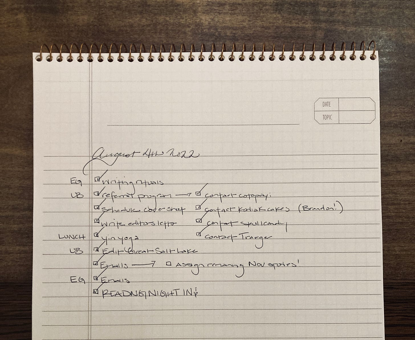 This is where we must talk about lists—I am obsessed with them. Every day, I open a fresh notebook page and create a list of what I want out of my day—this is my form of journaling. No matter what, writing is the very first thing on my list. I fill in the rest of my list after this, adding one item at a time until the day is done.