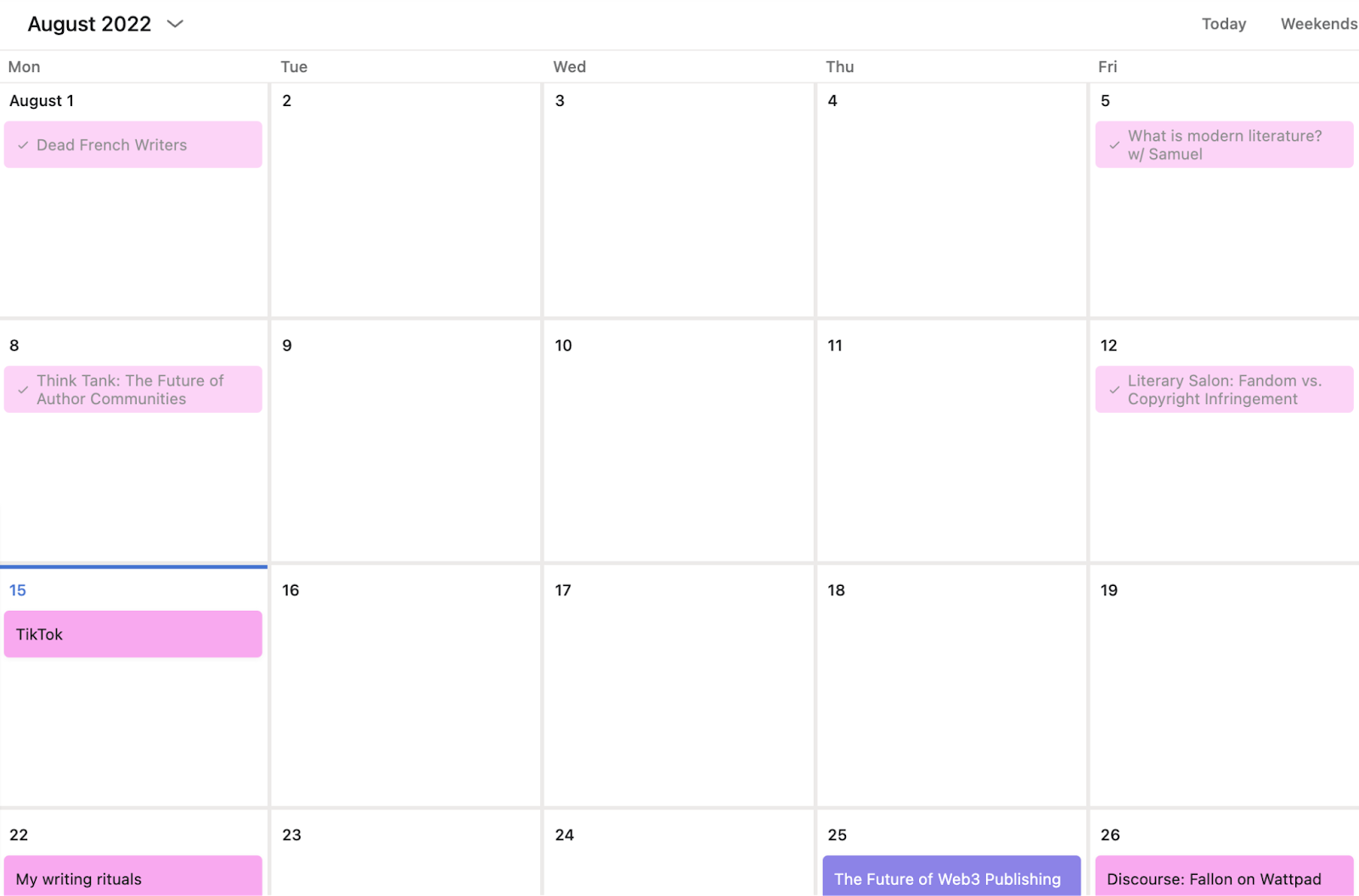 I followed this same process writing my novel—I just wrote novel chapters instead of newsletters. I still wrote in order, putting “chapter one” or “chapter two” as the first thing on my list. Now, as I get ready to write my second novel live, I’m scheduling novel chapters on my Asana content calendar in between newsletters. (Right now, I have the prologue tentatively scheduled for September/October!).