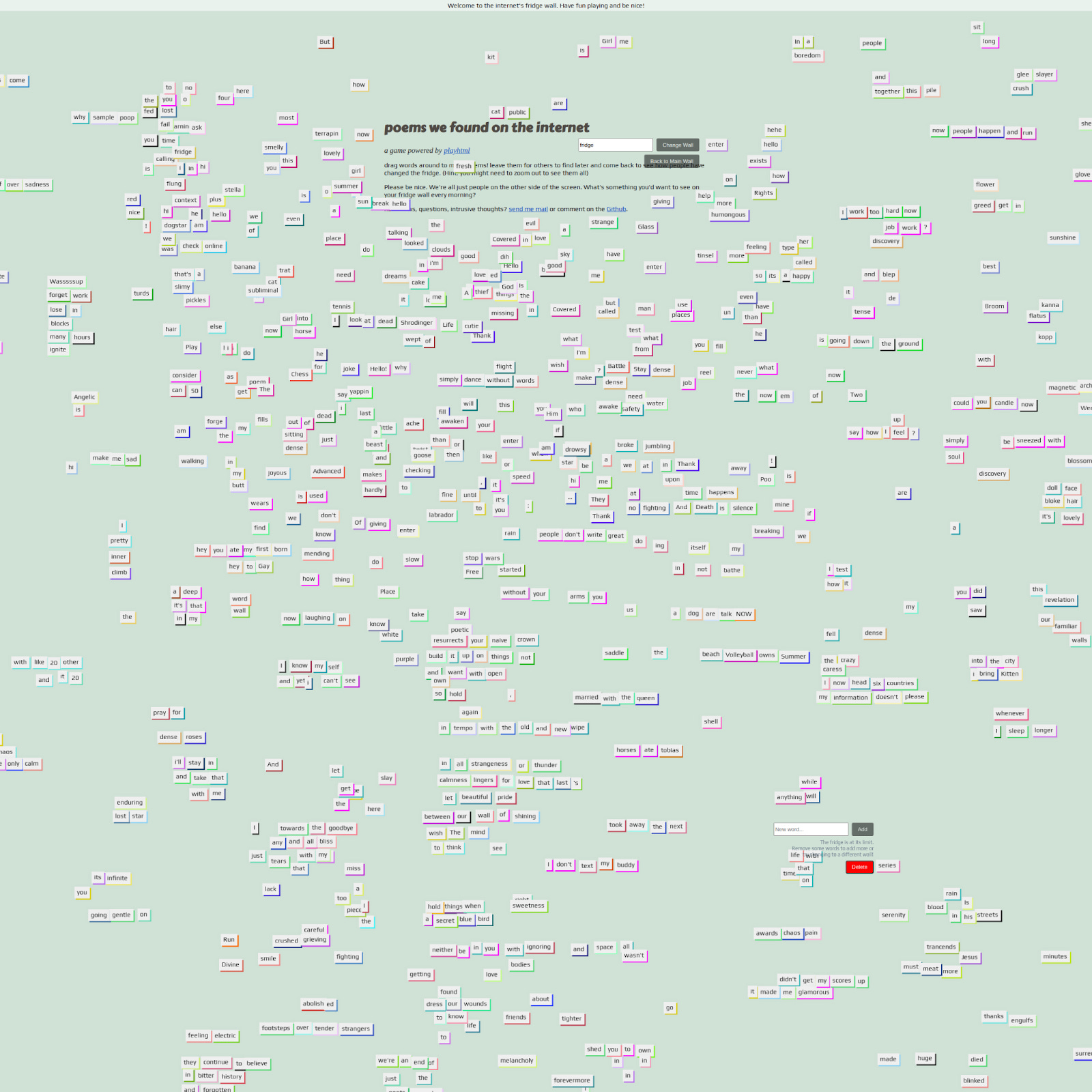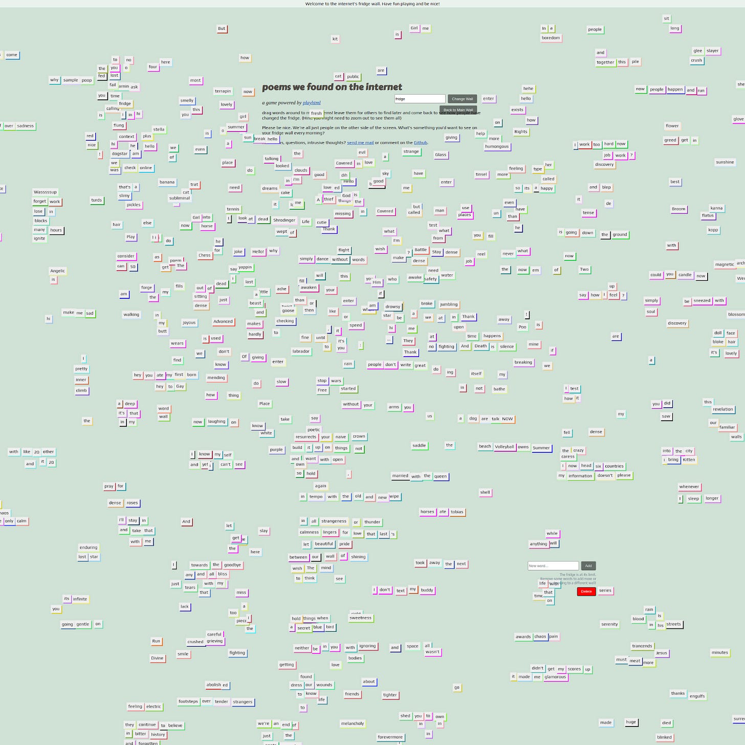 I’ve been experimenting with creating internet neighborhoods of my own, to make poems with strangers, turn the lights off to say good night, collect every color in existence, and grab a drink at the cursor bar after a long day scrolling.