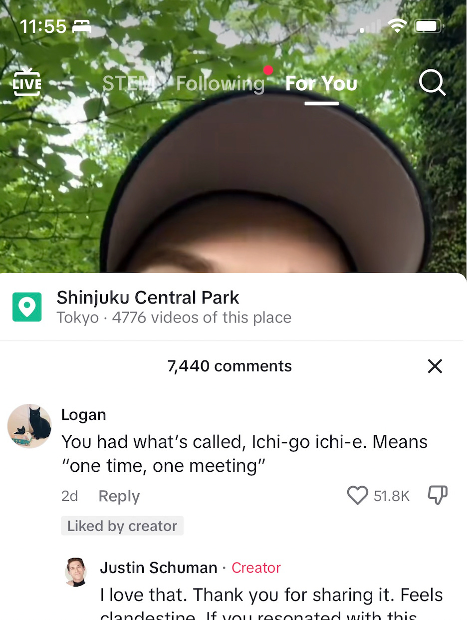 I actually rediscovered Ichigo ichi-e on my TikTok feed, in a spontaneous meeting via the algorithm several years ago. From what I can remember, the video featured a creator talking about a random encounter with an old man in Tokyo, how, in under 8 minutes, they shared the different problems their countries faced and uncovered this tangible sense of shared humanity.